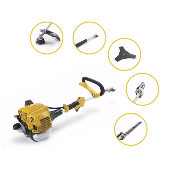 STIGA MT 330 - 5 in 1 to maszyna 5 w 1, której można używać z różnymi narzędziami napędzanymi tym samym silnikiem z zapłonem iskrowym o pojemności 25,4 cm³ i mocy netto 0,7 kW. Może służyć jako kosa z prostym wałem i nylonową głowicą Tap&Go z funkcją szybkiego zwalniania żyłki. 3-zębny nóż ułatwia cięcie najgęstszych krzewów. Nożyce do żywopłotu wymagają zastosowania dodatkowego noża 40 cm i głowic 180°, a listwa 25 cm ułatwia przycinanie. Wszystkich części i akcesoriów można używać z tyczką teleskopową 70 cm dostępną wraz z pojedynczymi szelkami.