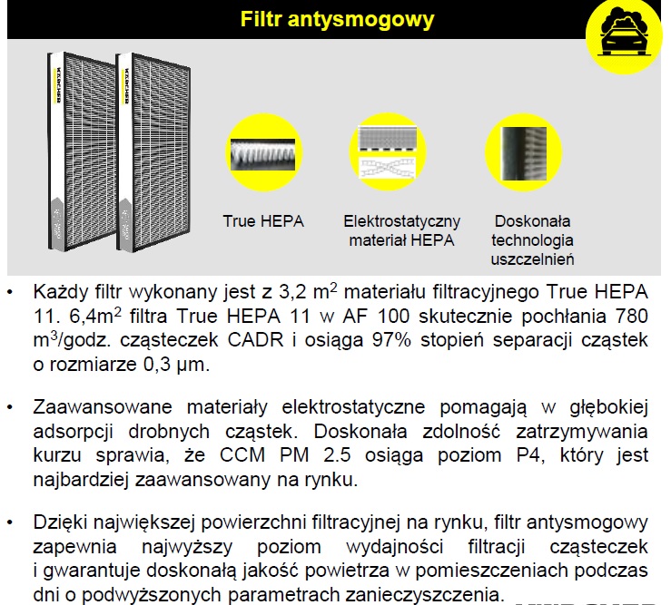 Skutecznie usuwa szkodliwe cząsteczki z powietrza. Filtry mające zastosowanie w poprawie jakości powietrza, w pomieszczeniach podczas podwyższonych stanów zanieczyszczenia smogiem.