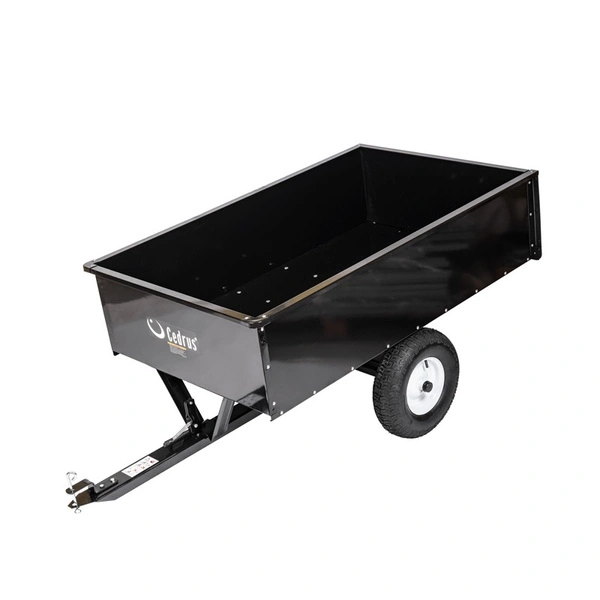 Przyczepka do traktorka ogrodowego o ładowności 600 kg, posiada funkcję wyrzutu oraz zdejmowaną burtę tylną.