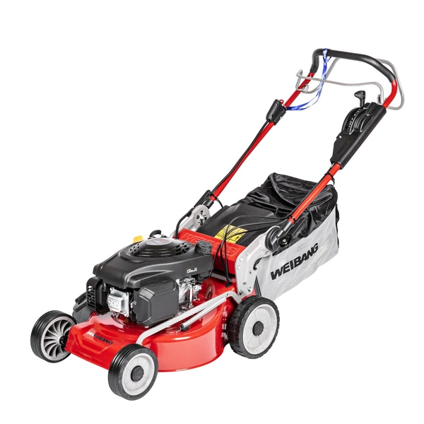 Kosiarka z elektrycznym rozruchem Weibang WB456SC VE 3IN1 posiada spalinowy silnik o pojemności 166cm3, aby go uruchomić wystarczy nacisnąć czerwony przycisk na uchwycie. Kosiarka spalinowa Weibang WB456SC VE 3IN1 zbiera trawę do pojemnego kosza, może ją także mielić lub wyrzucać na bok za pomocą specjalnego deflektora. Kosiarka napędzana jest za pomocą 3 stopniowej przekładni.