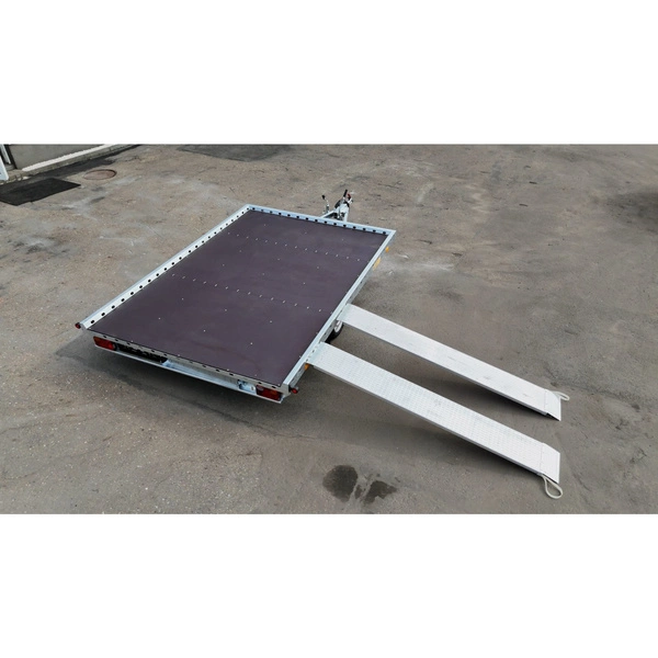 Przyczepa do transportu dwóch quadów oraz pojazdu typu UTV – jednoosiowa o dopuszczalnej masie całkowitej od 1000 do 1350kg. Przeznaczona do transportu dwóch Quadów oraz innych pojazdów czterokołowych. Rama wykonana ze stali S355MC o grubości do 4mm. Otworowana i przetłaczana konstrukcja z czterema wzmocnieniami poprzecznymi w podłodze. Powłoka antykorozyjna – ocynk ogniowy. 60 miesięcy gwarancji. Tylne podjazdy wykonane z aluminium.