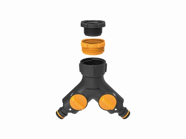 - Fiskars przylacze kranowe podwójne multi umozliwia jednoczesne podlaczenie dwóch wezy do jednego kranu. Dwa niezalezne zawory On/Off, regulujace przeplyw wody, sa latwe w obsludze i pozwalaja zamknac cisnienie wody na kazdym wezu.